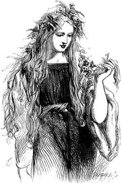 这是给您的茴香和漏斗花;这是给您的芸香;这儿还留着一些给我自己;遇到礼拜天,我们不妨叫它慈悲草。啊!您可以把您的芸香插戴得别致一点。这儿是一枝雏菊;我想要给您几朵紫罗兰,可是我父亲一死,它们全都谢了;他们说他死得很好——“(唱)”可爱的罗宾是我的宝贝。